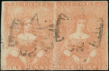 1d. dull orange-vermilion pair, [19-20], margins virtually all round, both cancelled by Butterfly "29" of Port Fairy, [20] with vertical crease not affecting appearance, otherwise fine. S.G. 8, £1300. Photo