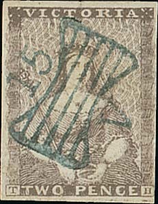 2d. dull grey, a deep shade with clear to large margins and neatly cancelled by blue Butterfly "15", horizontal crease at foot otherwise fine. S.G. 6a, £225. Photo