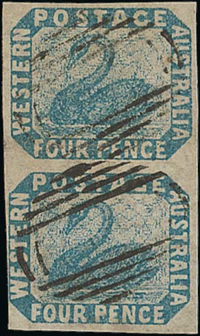 1854-55 imperf 4d. blue vertical pair with mainly good margins, the lower stamp touched at left, clearly cancelled by void obliterator, fine. S.G. 3a, £500. Photo