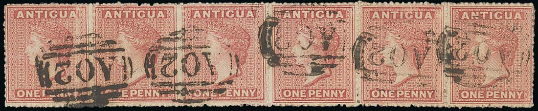 1863-67 Watermark Small Star, rough perf 14 to 16, 1d. bright rosy mauve horizontal strip of six, each cancelled "A02"; the first stamp with vertical crease, otherwise fine. A scarce multiple. S.G. 5. Photo