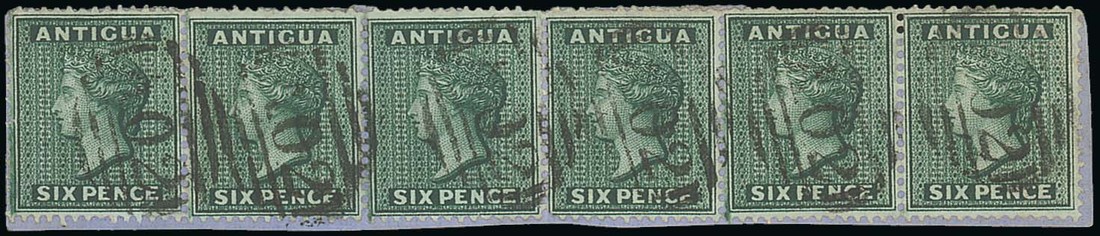 1876 CC, perf 14 6d. blue-green strip of six on fragment, each cancelled "A02"; a few small faults though generally of fine appearance. The largest recorded used multiple. S.G. 18. Photo