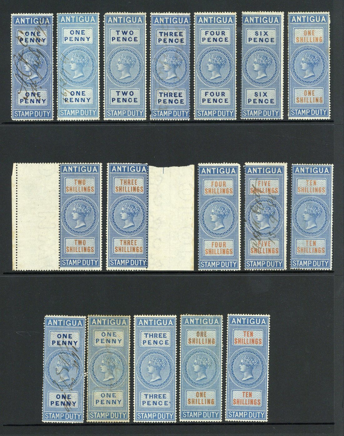 1870 Stamp Duty 1d. to 10/- set of eleven, fine mint (1d., 5/- used), with plate block of 2d., 1876 1d. to 10/- set of four, fine mint (1d. used), Minor faults as often with these large format issues, nevertheless a complete set as listed in Barefoot, with the 10/- very scarce. Barefoot 1-15