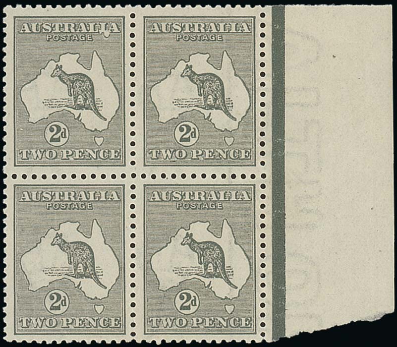 1913 First watermark, 2d. grey Die I block of four with sheet margin at right, the upper left stamp showing deformed "lia", fresh and fine mint, the variety unmounted. Rare. BW 7(1)k. Photo