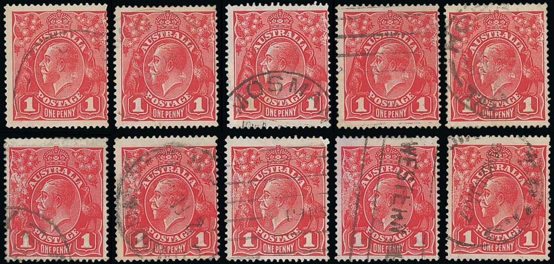1d. Plate 2, rusted (pre -substituted clichés), five "pairs" of these varieties, mostly with c.d.s. cancellations, chiefly clear or largely clear of the affected areas. One with RPSV Certificate (2001). BW 71(2)j and k. Photo