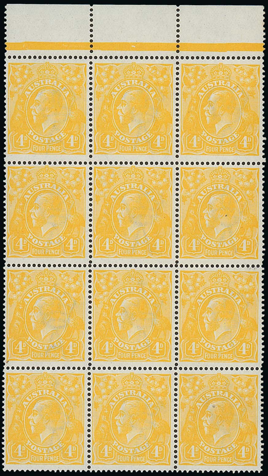 4d. lemon-yellow, block of twelve (3x4) from the top of the sheet, unmounted mint and fine. A rare and desirable multiple. BW110C, $10,800. S.G. 22c. Photo