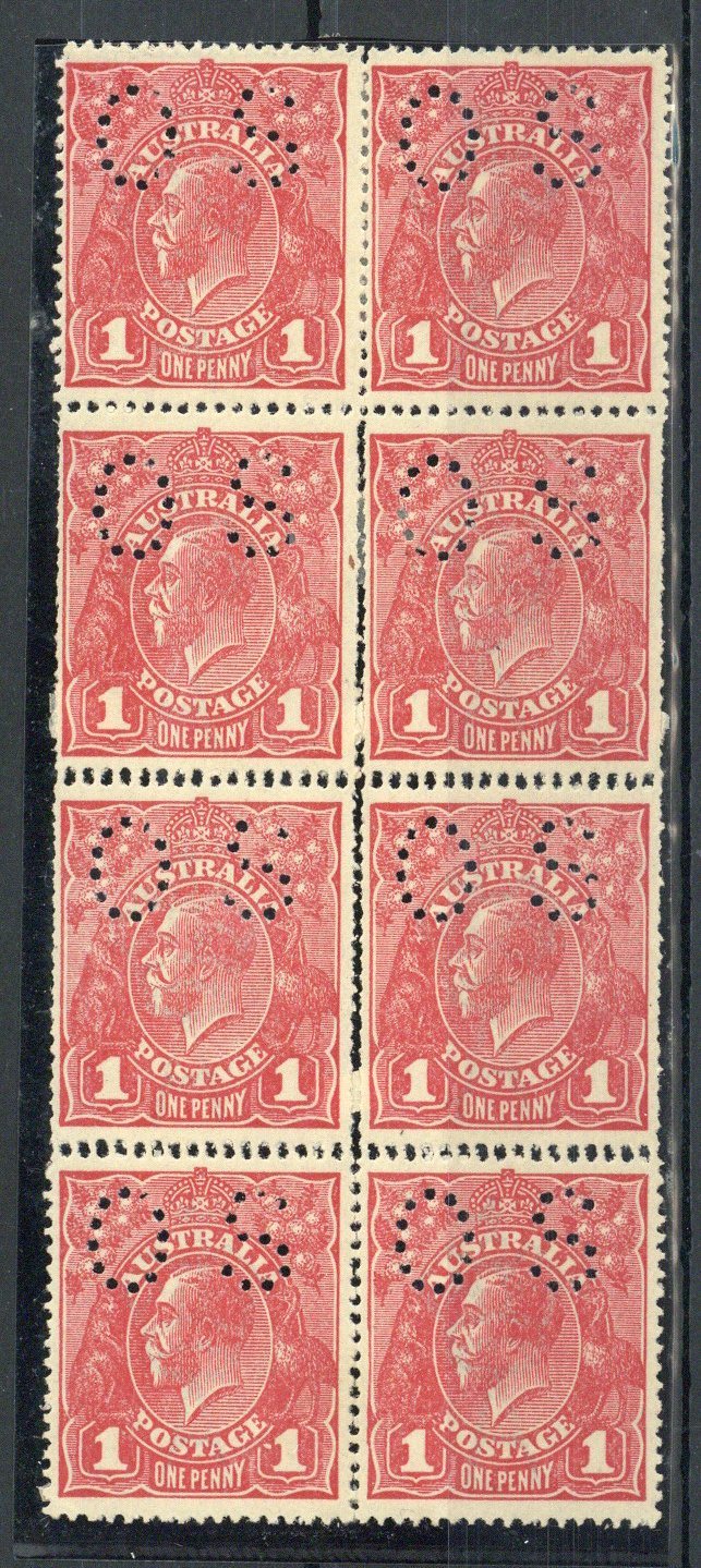 1d. Plate 3, block of eight (2x4) [R3-4/21-22] perforated "OS", showing dot before "1" at right and the centre block of four with double perfs. on three sides, original gum; some split perfs. strengthened by paper tabs