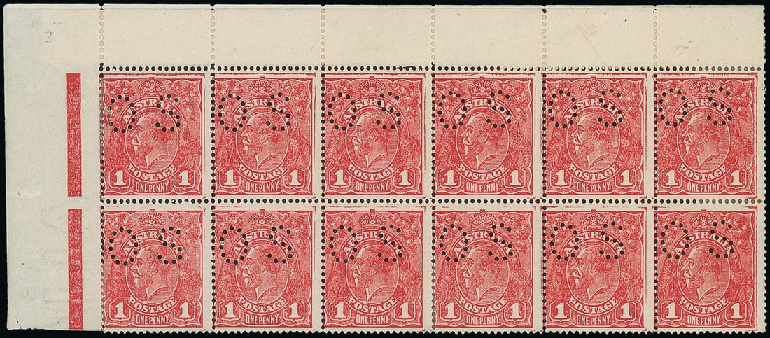 1d. brownish red, Plate 3, upper left corner block of twelve (6x2) perforated "OS", showing strong Compartment lines, especially at top left and top of the upper row, original gum with most remaining unmounted mint, off-centre but a fine block. BW72Nbb. Photo