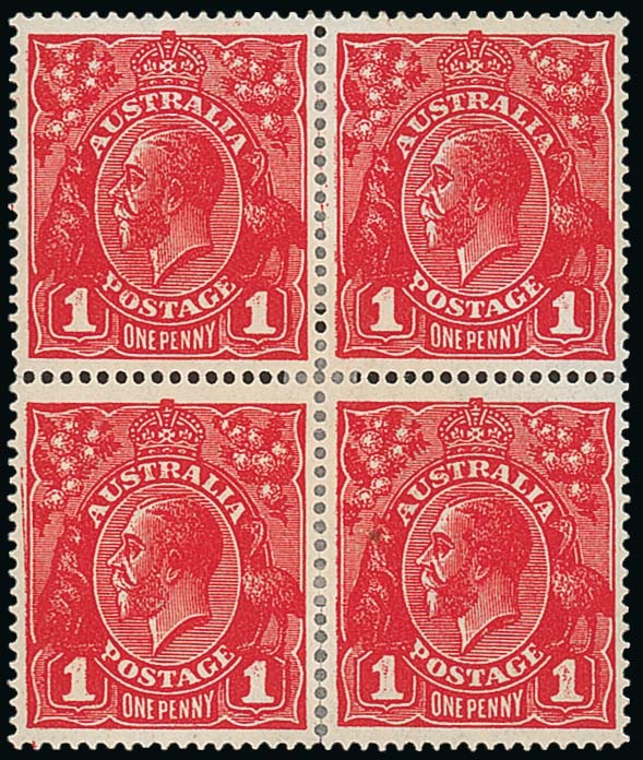1d. deep red block of four with "kiss print" variety, large part original gum, well centred; some perfs. severed and central vertical perfs. reinforced, fine. BW75Bca, $6,000. Photo