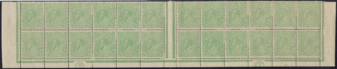 ½d. green block of twenty-four (12x2) being the lower two rows of the sheet with two "CA" monograms (the left hand "CA" substituted for "JBC"), large part original gum, extensive perf. strengthening and somewhat aged. BW65(4)zf, $3,000
