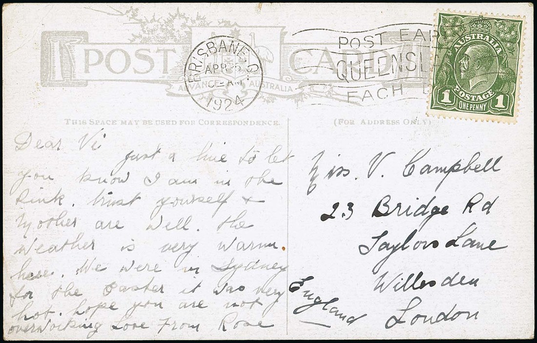 1d. sage-green, tied to coloured picture postcard (Fig Tree Bridge) to London by Brisbane slogan cancellation of 25 April 1924 (ANZAC day); fine. The earlier of the two recorded usages prior to the first official day of use, 1 May 1924.. Photo