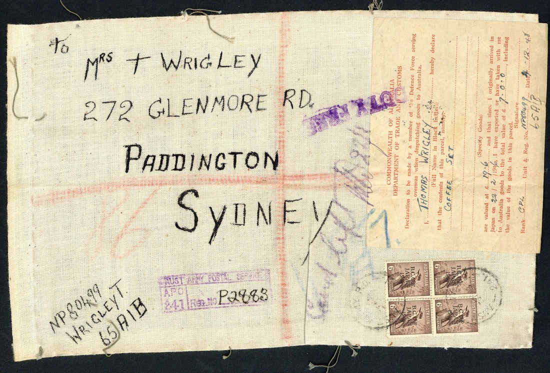 1948 (Dec.) complete linen parcel label (280x175mm.) with evidence of being stitched to the parcel, to Sydney bearing 6d. block of four tied by Army PO 241 c.d.s., showing APO 241 registration h.s. in violet and Defence Force Customs label affixed, duly completed, and tied by "duty free" h.s. in violet. A remarkable survivor, a commercial usage of the BCOF stamps, and an important postal history item. Photo