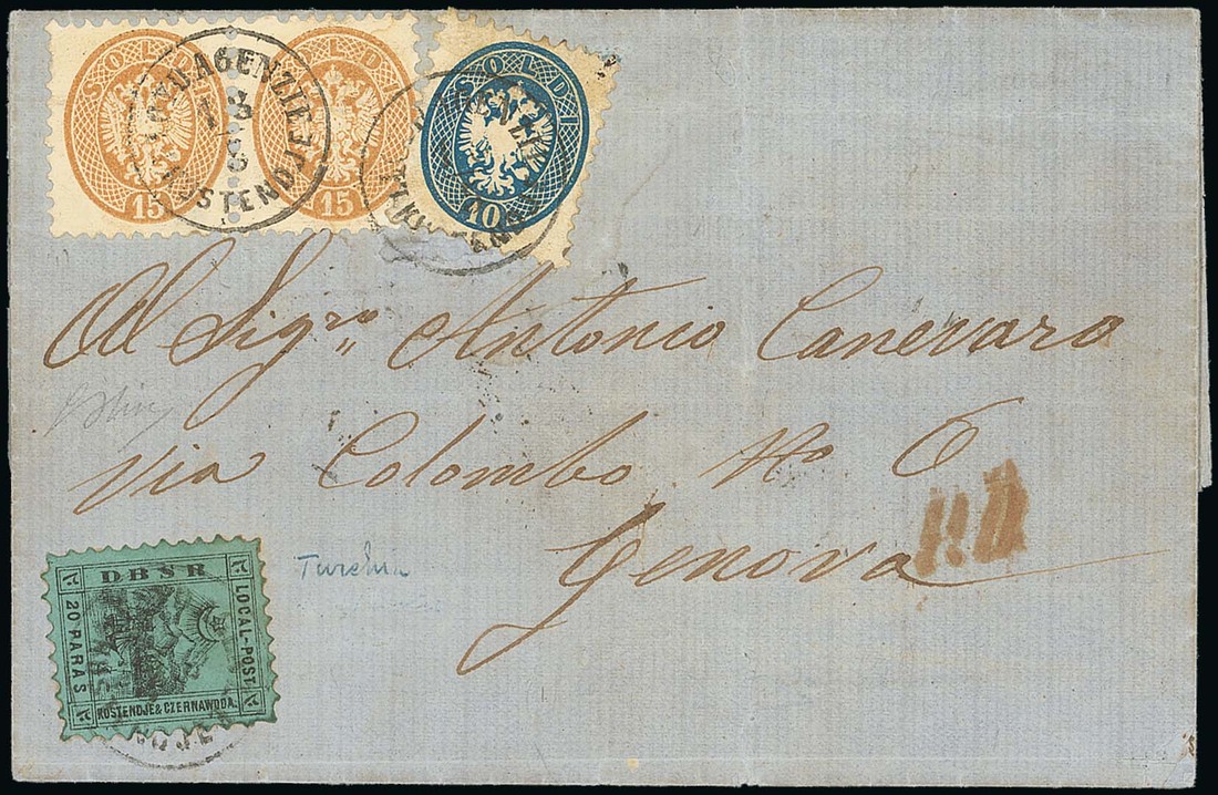 1868 (18 May) entire letter to Genoa bearing 1864 perf. 9½ 10s. blue, 15s. brown pair and Danube and Black Sea Railway 20pa. black on green local issue, all tied by "lloyd agenzie-kustendje 18/5" (Tchilinghirian figure 844) cancellations, transit and arrival markings on reverse; the 10s. re-affixed and the entire with some faults not affecting the very fine appearance. A tremendous rarity. Oliva (1965) and Sorani (1985) Certificates. Photo
