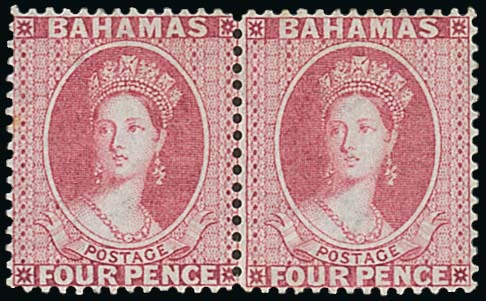 1863-67 CC perf 14, 4d. bright rose pair, unused with large part original gum, fresh and fine. S.G. 35, £800. Photo