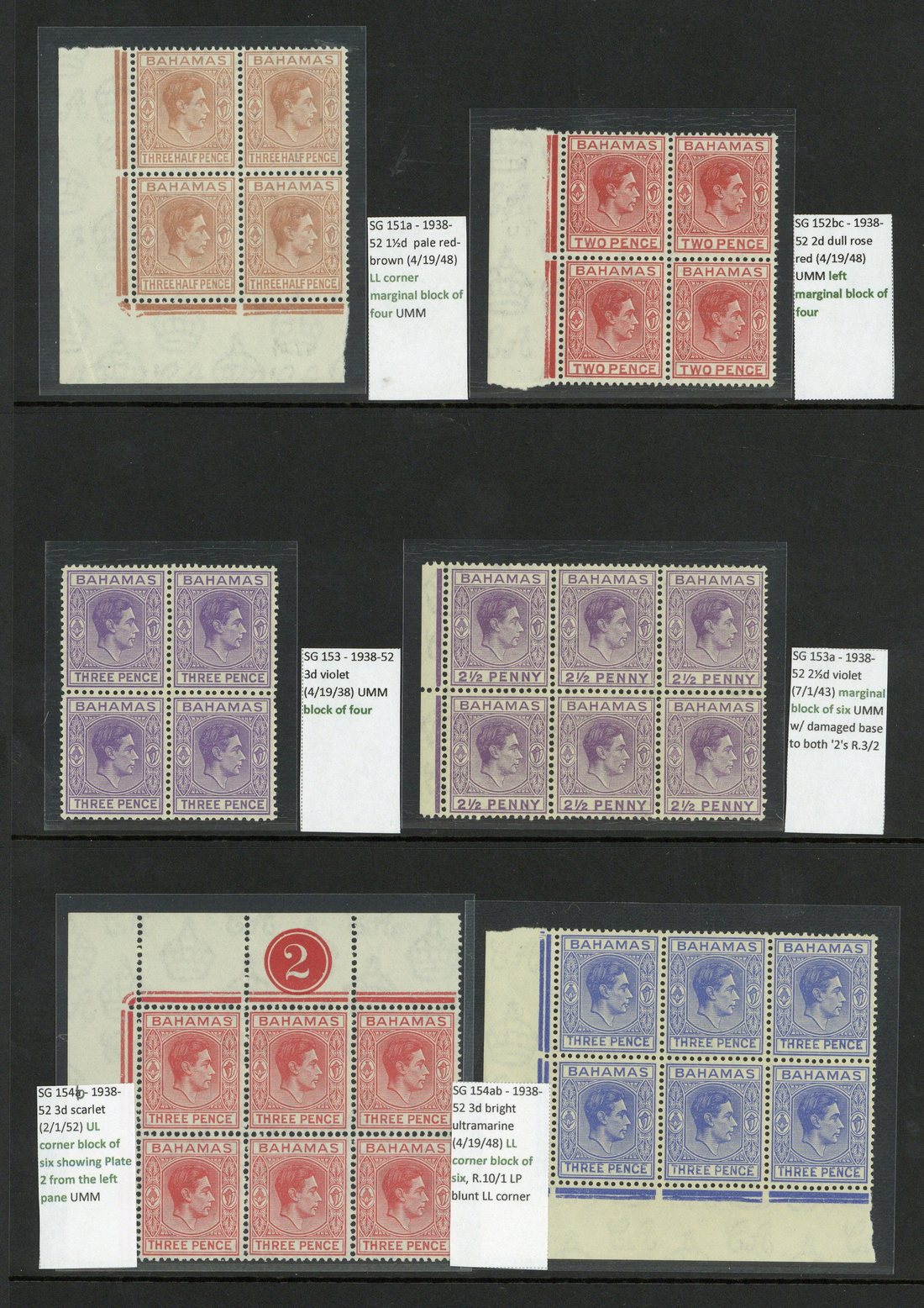½d. green, ½d. myrtle-green, 1d. carmine, 1½d., 2d. scarlet (3), and 3d. violet, all in blocks of four, ½d. bluish green corner plate block of six (2x3) and ½d. brown-purple block of six (3x2) with one in each showing elongated "E", 2½d. violet marginal block of six, 3d. light ultramarine corner block of six and 3d. scarlet upper left corner plate block of six, fresh mint and all apparently unmounted