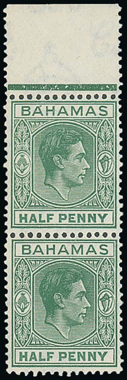 ½d. green marginal vertical pair from the top of the sheet, the upper stamp with accent flaw (Right pane R.1/5) which occurred on the December 1942 printing only, fine unmounted mint. S.G. 149b, £550+. Photo