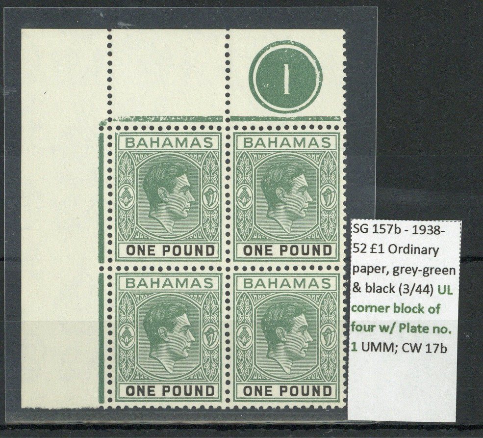£1 grey-green and black March 1944 printing upper left corner plate block of four, fresh unmounted mint. Fine and scarce, S,G, 157a, £240+