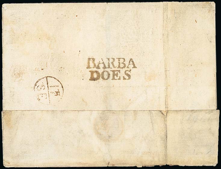 1761 (17 July) entire "p Capt. His Majesty's Ship Baimfiesant" to Rev. Dr. Bearcroft, Master of the Charter House, London, rated "10" and showing, on reverse a superb strike of the "barba/does" handstamp alongside Bishopmark (15.10); the first recorded date of use of this handstamp and one of only three recorded examples of mail transported from the island by warship. Photo