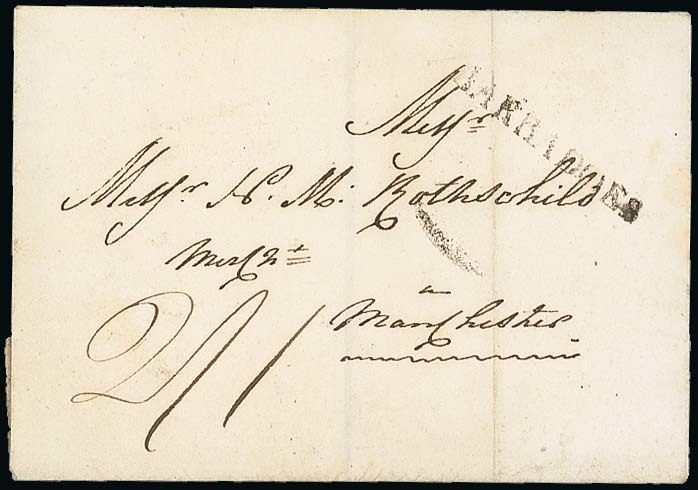 1808 (23 Aug.) entire to Manchester, rated "2/1" and showing a good strike of the "barbadoes" handstamp crossed by light filing crease, and 1811 (27 July) front and reverse flap to Liverpool, similarly rated and with largely fine "barbadoes" handstamp on reverse, no arrival markings. Photo