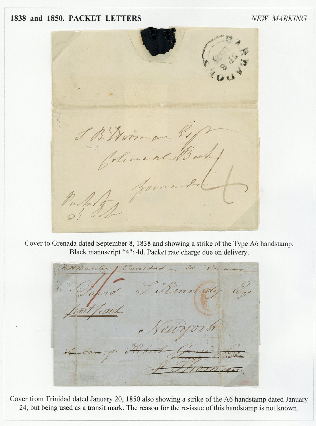 1838 packet letter entire to Grenada, rated "4" and showing, on reverse, fine "barbadoes" double-arc datestamp, and 1850 (Jan.) entire letter from Trinidad via St. Thomas to New York, rated "1/-" and showing, on reverse, Trinidad and Barbadoes double-arc datestamps