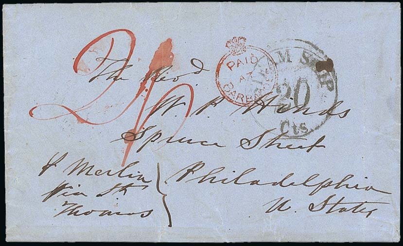 1852 (12 July) double rate entire letter "p. Merlin via St. Thomas" to Philadelphia, rated "2/-" and showing largely fine Crowned circle "paid/at/barbadoes" partially over-cancelled by "steam ship/20/Cts." handstamp, despatch and St. Thomas double-arc datestamps on reverse. Stated to be one of only three double rate covers with Crowned circles recorded. Photo