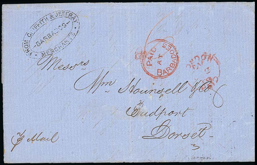 1858 (11 Sept.) entire to Dorset, rated "6" (the reduced packet letter rate, effective 1 August 1854) and showing sender's cachet and fine Crowned circle "paid/at/barbadoes" with London Paid datestamp alongside, despatch, local c.d.s. and Bridport (2.10) datestamps on reverse. Photo
