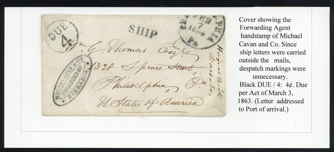 1864 envelope to Philadelphia, sent outside the mails and showing forwarding agents cachet of Michael Cavan & Co. used as a sender's mark, "ship" handstamp, circular-framed "due/4" and large part arrival datestamp (7.2)