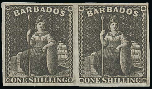 1858 (Nov.) no wmk. 1/- black horizontal pair with mostly large margins, unused with large part original gum, fresh and fine. B.P.A. Certificate (2006). S.G. 12a, £450. Photo