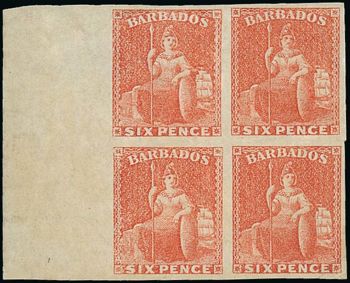 6d. dull orange-vermilion marginal block of four from the left of the sheet, variety imperforate, large part original gum, fine. Also 1872 wmk. Large Star, clean-cut perf 14½ to 15½, 6d. orange-vermilion pair with sheet margin at right, variety imperforate, unused without gum, fine. R.P.S. Certificate (1990) for block. S.G. 32a, 60b; £1600. Photo for first