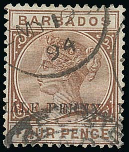 1892 (July) ½d. on 4d. deep brown, variety surcharge double (black and red), cancelled with part 1894 datestamp and small part Registered datestamp leaving much of surcharge line clear. Scarce. R.P.S. Certificate (1971). S.G. 104b, £1,200. Photo