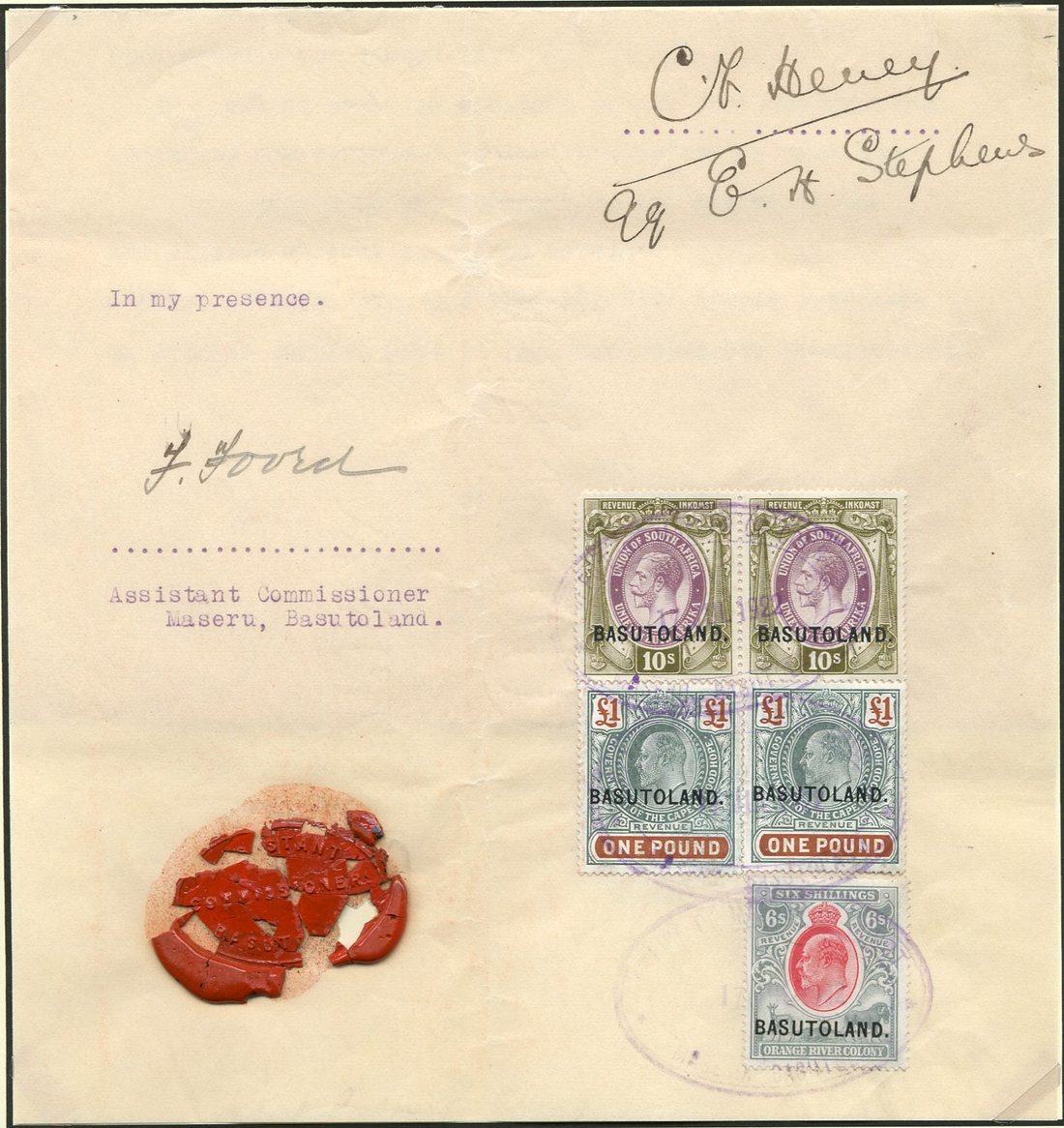 1922 Mortgage Bond page bearing c.1912 Series 13 £1 on Cape (2), and 6/- on Orange River Colony, with Series 15 on South Africa 10/- green and deep reddish purple (2), all cancelled with faint "...court/ maseru basutoland" oval d.s. in purple, with red wax seal at left. Fine. Photo