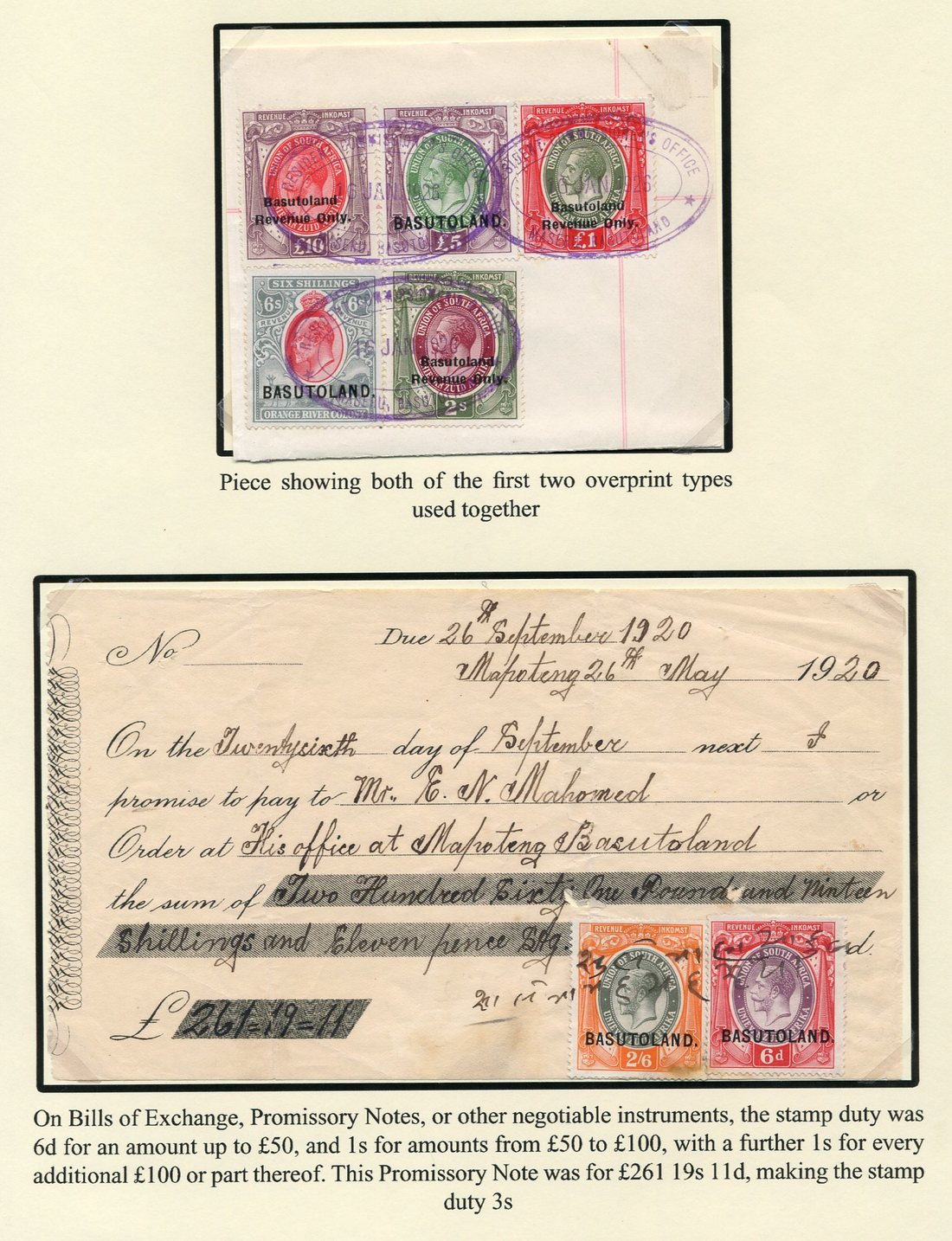 1926 Document piece bearing c.1923 Series 18 on South Africa 2/-, £1 and £10, with c.1912 Series 13 6/- on Cape and c.1918 Series 15 £5, all cancelled by "resident commissioner's office/ maseru basutoland", offered with complete promissory note for £261/19/11d. bearing c.1918 series 15 6d. and 2/6d. Promissory note with faults (toning to 2/6d. and punch holes), the document piece very fine. Photo