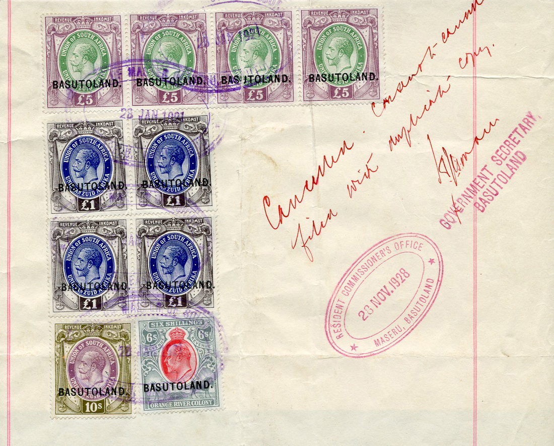 1928 General Bond page bearing Series 16 on South Africa £5 (4), £1 (4), and 10/-, and Series 13 on Orange River Colony 6/-, all cancelled by "office of master of court/ maseru" 1919 oval datestamps in violet, with annotations and red 1928 handstamps (2) at right. Filing creases affecting three stamps, nevertheless a scarce and attractive piece. Photo