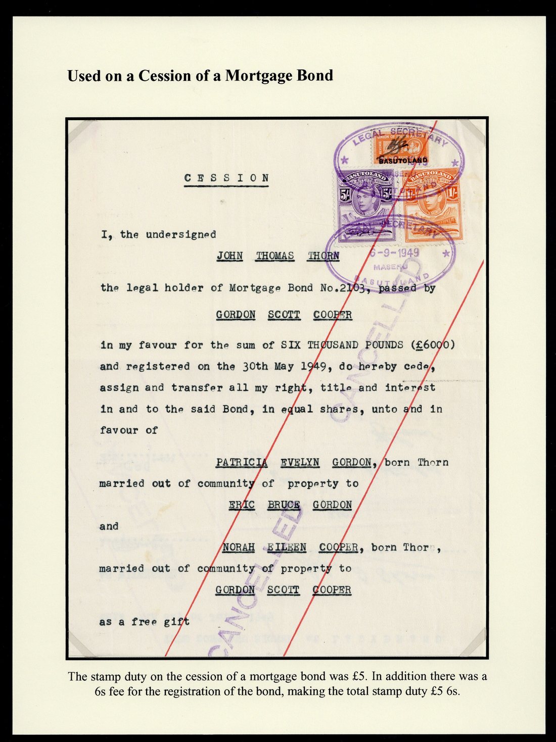 1949 Mortgage Bond page bearing Series 31 £5 Orange 'Bantam', with KGVI "postage/revenue" 5/- violet and 1/- red-orange, all cancelled with "legal secretary/ maseru/ basutoland" oval d.s. in violet. Fine and scarce.