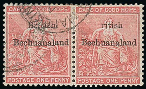 1885-87 on Cape, 1d. rose-red pair, the right stamp showing variety "ritish", fine used with two small part Mafeking c.d.s. Rare. R.P.S. Certificate (1932). S.G. 5a, £2250. Photo