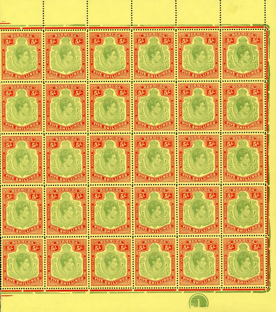 1938-53 5/- green and scarlet on yellow chalk surfaced paper, perf 13, complete sheet of 60 in two halves, fine unmounted mint. An extremely rare survival. S.G. 118g, £3,600