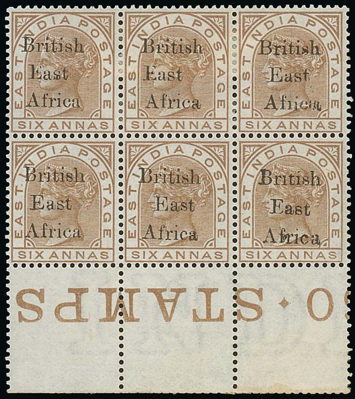 1895-96 on India, 6a. pale brown block of six (3x2) with margin at foot, (R.9-10/6-8 of lower left pane), showing variety "Br1tish" on R.10/8, and "ica" inserted by hand on R.9/8, unused with part original gum (lower row unmounted), fine. A unique and wonderful positional piece. B.P.A. Certificate (2006). S.G. 56/56a var. Photo