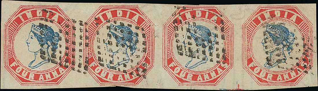 Blue and red horizontal strip of four, [7-10], good to large margins nearly all round ([8] with small scissor-cut into design at base) and showing portions of central guide crosses below [9-10], each neatly cancelled with diamond of 64 dots. A fine, attractive and rare multiple. B.P.A. Certificate (2015). S.G. 23 group. Photo
