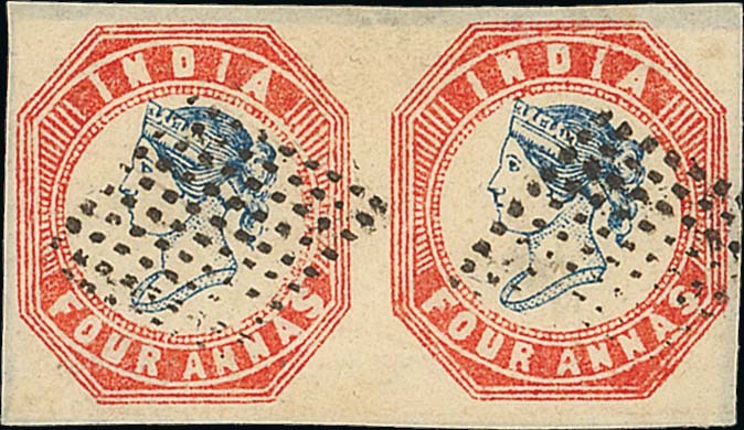 Blue and red horizontal pair, [11-12], good to large margins and both neatly cancelled by diamond of ninety dots; very fine and most attractive. S.G. 23 group. Photo