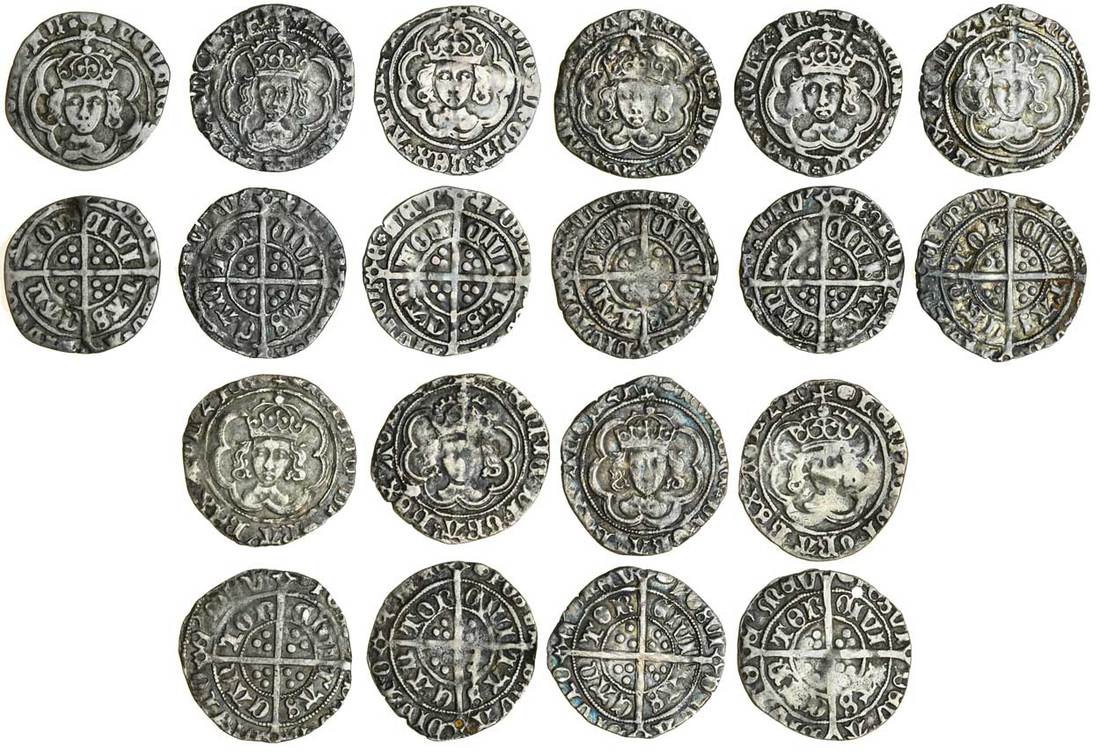 Henry VII (1485-1509), Halfgroats (10), Canterbury, King and Archbishop Morton jointly, type IIIA (2), 1.24g, trefoils, 1.31g, rosettes, type IIIB (3), 1.40g, rosettes, 1.42g, tor/don, 1.30g, adivtoe, type IIIC (4), 1.43g, agli z f, 1.53g, agl z fr, 1.36g, saltires. 1.27g, angl z f, and type IIID (1), 1.35g, al facing bust (N.1712; S.2209, 2210, 2211; Stewartby p.441), all different varieties, mostly good fine to almost very fine, a useful group (10)