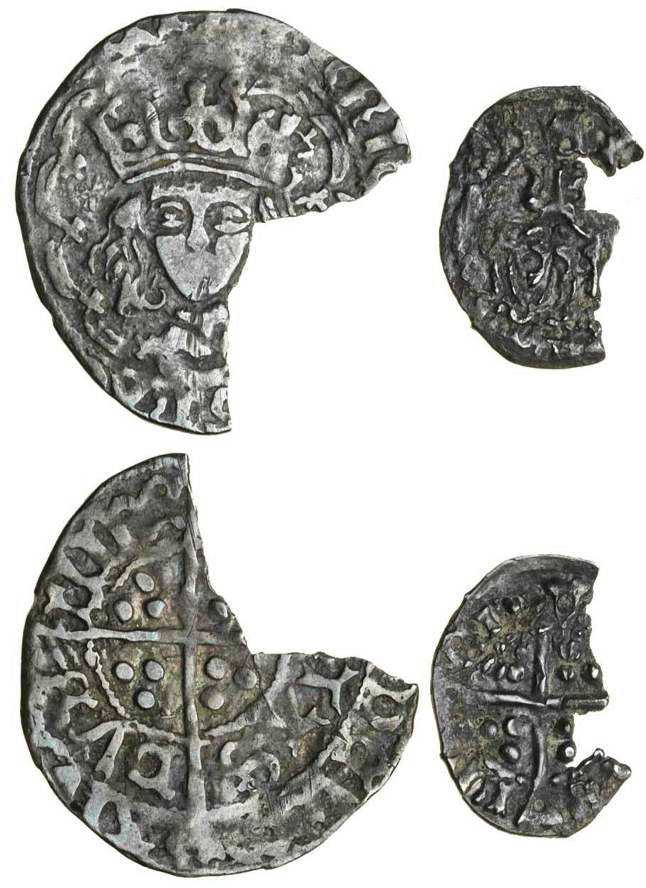 Ireland, Henry VII (1485-1509), Groat, Dublin, late issue, 1.31g, type IIC, saltires on points of tressure (DF 198; S.6460), and Penny, Dublin, late issue, 0.35g, type II, h under arched crown, rev. civ[ ]vb lin, long cross with pierced cross ends (S.6468), both large fragments, fine, the first rare, the second extremely rare (2)