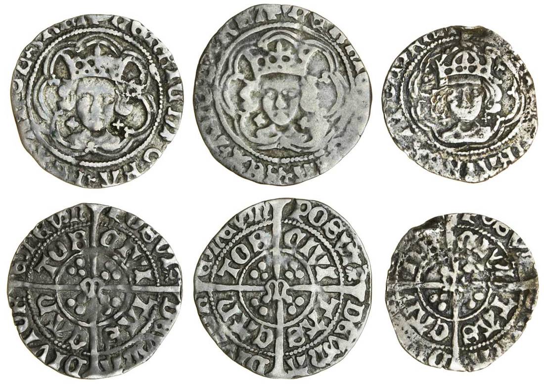Henry VII (1485-1509), Halfgroats (3), Canterbury under Archbishop Morton, type I/IIa mule (2), 1.52g, m.m. tun/-, henric di gra rex angl z fra, facing bust, open crown, trefoil stops both sides and on cusps, crosses by neck, rev. posvi devm (pellet) adivtore mevm, civi tas can tor, m at centre; 1.36g, as previous but nothing after devm; type IIa, 1.18g, tun after gra, double arched crown, rev. as first coin (N.1710/1711 (2), 1711; S.2207/2208 (2), 2208; Stewartby p.440-1), fine and better, the first two not recorded by Lord Stewartby, the last clipped, all rare (3)