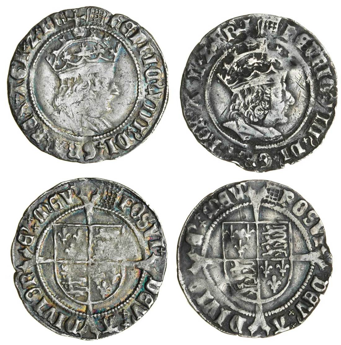 Henry VIII (1509-47), first coinage, Groats (2), 3.03g, m.m. crowned portcullis (obv. with chains), henric viii di gra rex agl z fr, single saltire stops, crowned bust right, rev. double saltire stops, single saltire after posvi; 2.81g, as previous, rev. adivtoe (N.1762; S.2316; Stewartby p.437), edge splits, good fine (2)
