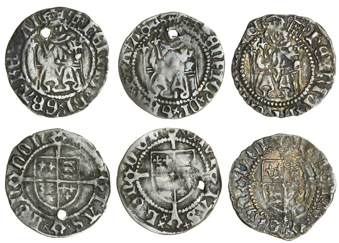 Henry VIII (1509-47), first coinage, Pennies (3), London, all ‘Sovereign’ type, 0.75g, m.m. castle/-, henric di gra rex al, saltire stops, king on throne holding orb and lis-topped sceptre, lis on pillars, rev. civi tas lon don, saltire stops, shield on long cross fourchée; 0.73g, m.m. portcullis no chains/-, rex agl, otherwise as previous; 0.75g, m.m. crowned portcullis with chains/-, otherwise as previous (N.1773; S.2328; Stewartby p.448, the last pl.31/558 this coin), fine to very fine, the first two pierced and both rare, the last toned and very rare (3)