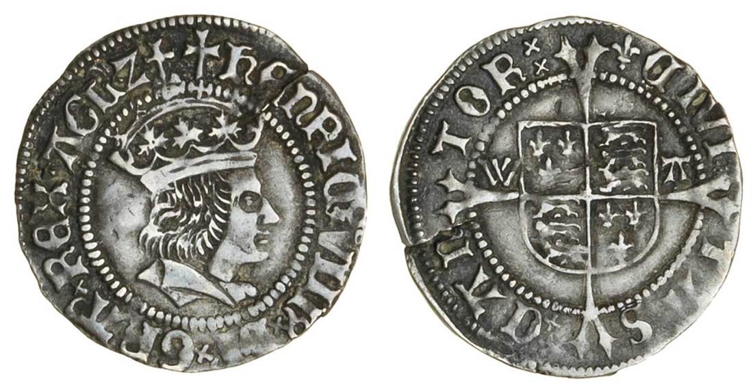 Henry VIII (1509-47), first coinage, Halfgroat, Canterbury under Archbishop Warham, Ic/IIa mule, 1.56g, m.m. cross fitchée/lis, henric viii di gra rex agl z, saltire stops, crowned bust right, rev. civi tas can tor, saltire stops, shield on long cross fourchée, w a at sides (N.1766; S.2322; Stewartby p.443), edge crack at 2 o’clock, otherwise very fine, very rare