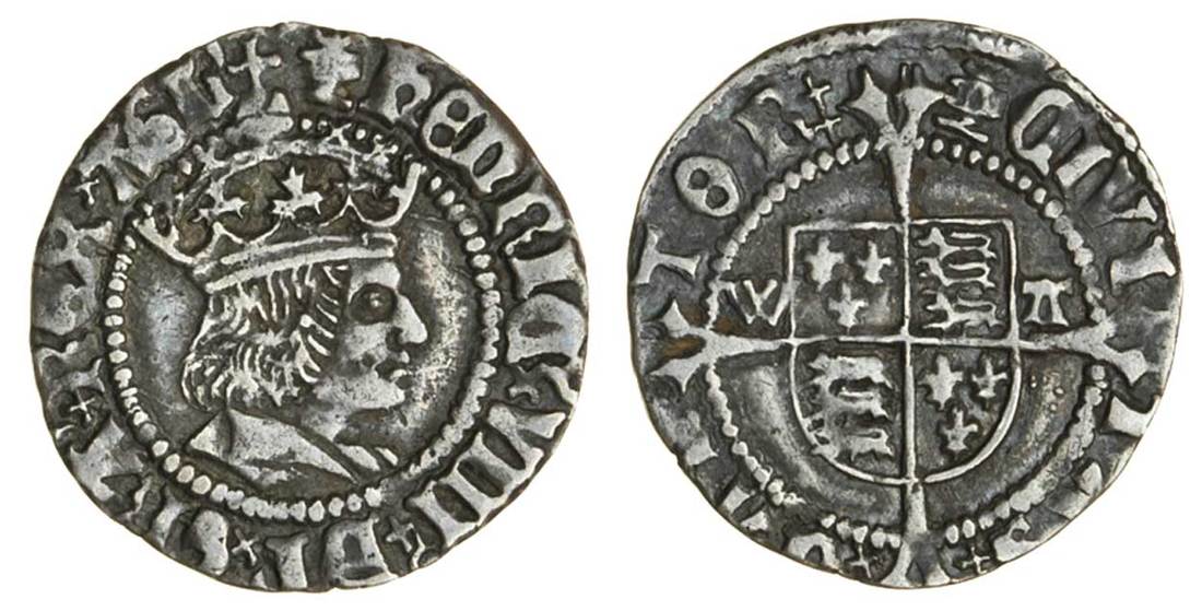 Henry VIII (1509-47), first coinage, Halfgroat, Canterbury under Archbishop Warham, IIb, 1.27g, m.m. pomegranate, henric viii di gra rex agl, saltire stops, crowned bust right, rev. civi tas can tor, saltire stops, shield on long cross fourchée, w a at sides (N.1767; S.2322; Stewartby p.443), very fine