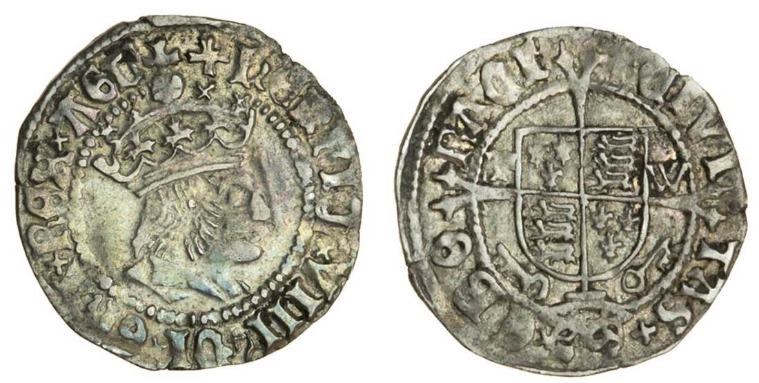 Henry VIII (1509-47), first coinage, Halfgroat, York under Archbishop Wolsey, type IIf, 1.38g, m.m. star, henric viii di gra rex agl, saltire stops, crowned bust right, rev. civi tas ebo raci, saltire stops, shield on long cross fourchée, t w beside shield, keys and hat (N.1772; S.2327; Stewartby p.443), toned, very fine and rare
