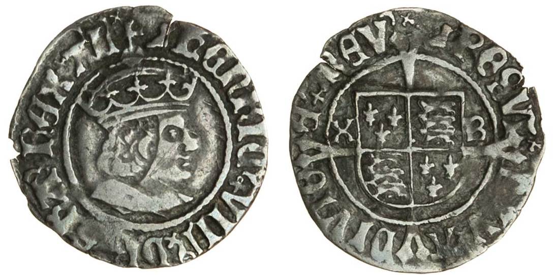 Henry VIII (1509-47), first coinage, Halfgroat, York under Archbishop Bainbridge, Ib, 1.19g, m.m. martlet, henric viij di gra rex al, saltire stops, crowned bust right, rev. posvi dev adivtoe mev, saltire stops, shield on long cross fourchée, x b beside shield, saltires in two cross ends (N.1768; S.2324; Stewartby p.443), small edge splits, otherwise nearly very fine, rare
