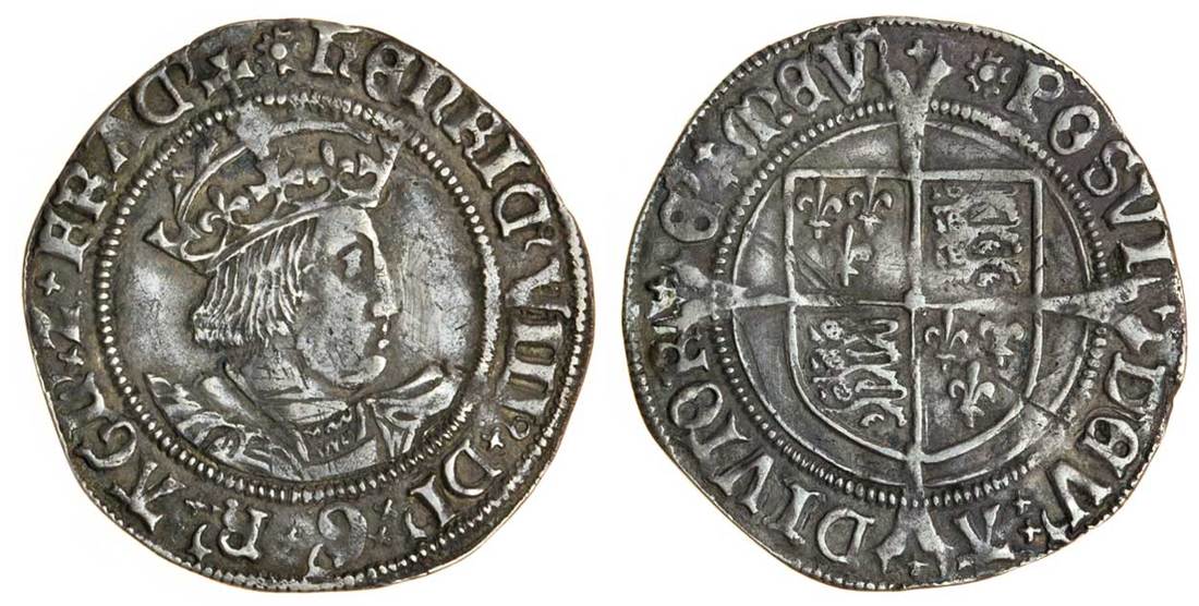 Henry VIII (1509-47), second coinage, Groat, 2.52g, m.m. rose, henric viii di g r agl z frac, inverted Roman d for c, saltire stops, crowned bust right, rev. posvi dev adivtore mev, mixed letters, saltire stops, shield on long cross fourchée, saltires in forks (N.1797; S.2337D; Stewartby p.471; Laker B), marks to the reverse, otherwise very fine, rare