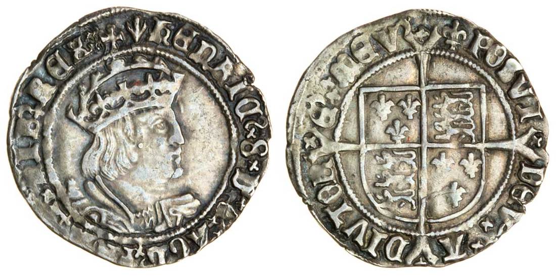 Henry VIII (1509-47), second coinage, Groat, 2.69g, m.m. pheon/lis, henric 8 d g agl fra z hib rex, saltire stops, crowned bust right, rev. posvi dev adivtore mev, saltire stops, shield on long cross fourchée, saltires in forks (N.1798; S.2338; Stewartby p.471; Laker D), very fine, very rare