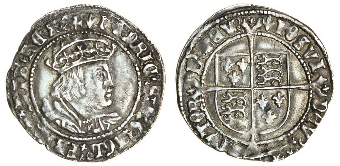 Henry VIII (1509-47), second coinage, Groat, 2.72g, m.m. pheon, henric 8 d g agl fra z hib rex, saltire stops, crowned bust right, rev. posvi dev adivtore mev, saltire stops, shield on long cross fourchée, saltires in forks (N.1798; S.2338; Stewartby p.471; Laker D), very fine, very rare